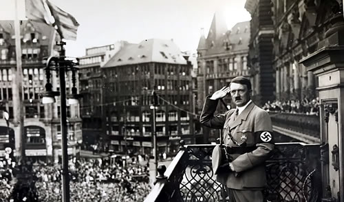 Trüch to mien Vadder, trüch to de uhrenbedüselnde Heiljubelee för Hitler. De Sünn schient, Vadder sweet in siene SA-Uniform, he steiht mit den Rüch to de Fohrbohn, de Arms warrt em lohm vun dat Fasthollen mit siene Nevenlüüd, aver nu nu endlich kümmt HE: uns 'Führer' Adolf Hitler! De Minschen schuuvt un schuuvt na vörn, de Keed ut SA-Mannen drauht to rieten! Hitler aver steiht in en groot, apen Auto un lett sik heel langsom an uns düütsche Döösköpp vörbikutscheren. Eernst kiekt he ut de Wäsch, wieldat he doch de hele Verantworden driggt, hett mien Vadder seggt. Un nu grööt he uns mit sien utreckten rechten Arm: Hitler mookt den Hitlergruß!