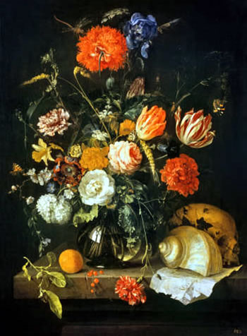 "Jojo", segg ik, "arm Diert!" Un gah mien'n Weg. Dat Lamm? Wat geiht dat mi an! Is dat denn wichtig för mi? Is doch sien Lamm or nich? Wi hefft nu woll so den halven Weg, denn sünd wi in Jerusalem. De mehrste Tiet hefft wi aver schafft. Ik frei mi al bald sünd wi woll dor... Jesus snackt mitünner ganz markwürdig. Mi is, as snack he över't Starven aver wenn ik anfang to lustern, denn is al wedder Sünnschien. Mi is ganz wunnerlich tomoot bi düsse Reis'. Jerusalem dat Woort klingt, as beiert de Klocken von överall aver ik weet nich jichenswo hüür ik wat as weent dor'n Kind in de Düüsternis. Bild: Jan Davidszoon de Heem, Memento