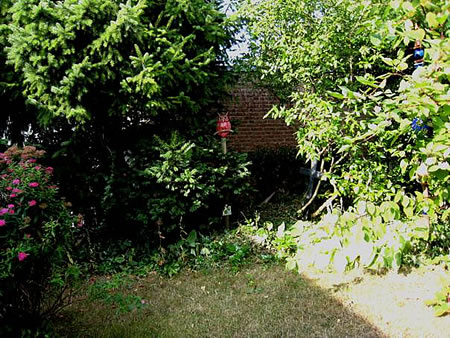 Baven in de linke Eck vun uns Grundstück harr de späder buen Naver in "Grenzbebauung" sien Garaasch sett. Inge harr dorneven mit de Tiet "unsen lütten Woold" hoochtrocken. De Vagels bröchten Ieven. Inge hülp twei, dat se gaud wassen kunnen. Denn steiht vörn to Schutz un Schuul en groote Glasbeerenstruuk un en Wittdoorn. Un dat Vogelrestaurant sünd de Cornuns un de Berberitz. Ünnen an den spitz tolopen Woold wasst nu en dull besneden Wittdann un en Omorikaficht. To'n Afsluss harr Inge de ut Rocksholt mitbröchten Blaumen Bachnelkenwurz, Frauenmantel, Anemone und Wurmfarn plant. Se müßt sorgen, dat se gaud Wader un Schadden kregen. Vun den Naver achter uns keem Bäukenloof, so dat en rechte Wooldbodden entstünn, in den sik de bi uns anfunnene Schildkrööt 40 Johr en'n Slaapplatz un Ünnerkruup buute. In de dichten Strüker harrn lütte Vagels ehre Nester, un in de Berberitz un den Cornus fünnen se ehre Beeren. Wenn de riep weeren, harrn wi veel Besöök.