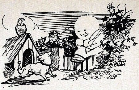 All de Blomen slåpen in, nickt mit seehr lütten Köpp åvers de Hoffhund Hasso, dee slöppt nich! Hee kümmt ut sien Hunnenhütt sprungen un bellt den Mååndschien an. "Wau, wau, wat söchst du hier in uns'n Goorn? Worüm kümmst du blots 's Nachts? Büst woll een Deev! Wau, wau! Mååk, dat du wiederkümmst!" De Mååndschien lacht, stråkelt den Hund un seggt: "Ja, ja! Du büst en bråve Keerl un passt goot op Huus un Hoff op. Ik bün åvers keen Deev! Magst mi nich lieden? Ja, ja! Wees man still, ik gåh jå all wieder. Gode Nacht!"