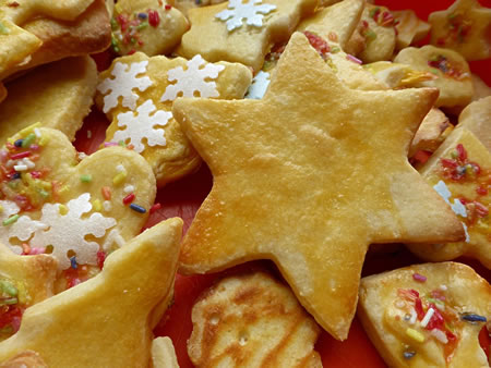 Dor keken all de Steerns in de Köök rin. Dor harr de Modder jüst en grote, swarte Kokenplååt ut den Åven trocken. Op de Kokenplååt legen vele Kokendeegsteerns, dee richtig schöön goldgeel backt weern.