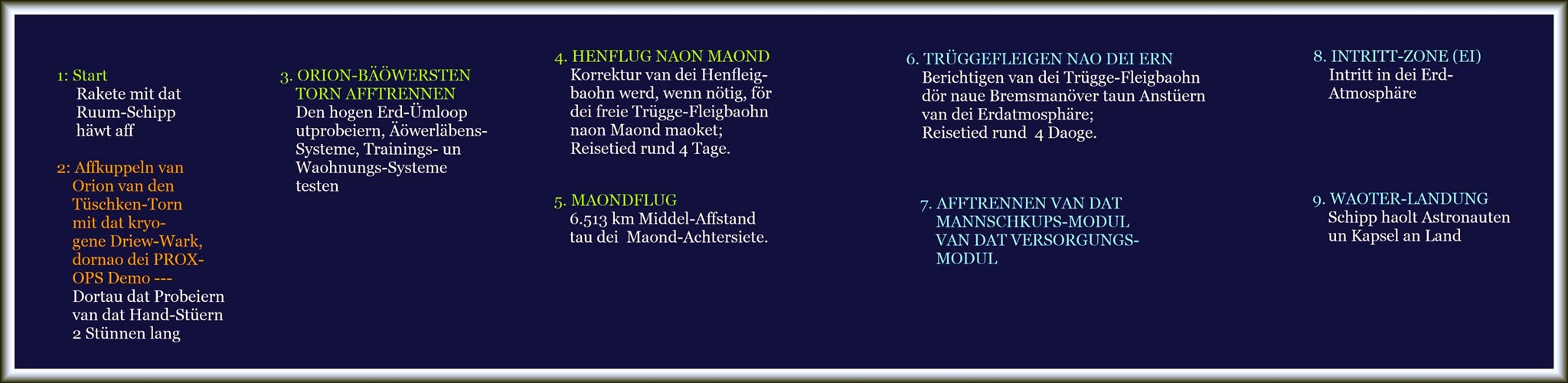 Mehr Info över dei Vörbereiden: NASA arbeitet auf die Artemis-II-Mondmission hin Nu hätt dei Astronauten-Mannschup ehr Wark vörnanner un dei Technik-Lüe häbbt dat Raketensystem ut dei grote Halle feuhert un an'n 17. Januar 2026 up dei Start-Stäe 39B affstellt. 12 Stünnen hätt disse Fohrt mit dei fardig upstellte Rakete un den Start-Torn duuert. Dei Bodden-Mannschkupen sünd midden in ehre mehrdaogs Tests van dei Funkfrequenz-Kommunikation tüschken dei Rakete un dat Kontroll-Sytem Eastern Range. Dei Technikers schäöllt all an dit Wäkenend mit dat Praotmaoken van dei beiden Faststoff-Driewers anfangen. In dei Orionkapsel laodt man dei leßten Saoken, Tablets för dei Mannschkup, Medizin-Utrüstung un Apparaote för dei Wätenschkup. Dortau hört uck dat AVATAR-Forschkung. Dissse Forschkung löpp tausaome mit annere Studien äöwer dei Gesundheit un dat Kontant-Wän van dei Artemis-II-Astronauten. Dei NASA will so rutfinnen, wo man dei Gesundheit van dei Astronauten an'n besten wohren kann bi dei Aktionen up den Maond-Bodden off läöter hen up den Mars. Bi den Test-Affloop (WDR) schäöllt dei Mannschkupen wiesen, dat sei mehr at 700.000 Gallonen kryogene Driew-Stoffe in dei Rakete tanken käönt. Dotau schäöllt sei den Start-Countdown un dat Ut-Tanken van den Driew-Stoff ut dei Rakete euwen, dorbi warket dei Atronauten aower nich mit. Wenn et wän mutt, käönt dei Technikers dei SLS un Orion för nödige Arbeiten wedder trügge feuhern in dei hoge Raketen-Upbau-Halle. Dat Start-Fenster för Artemis II gaiht an'n 6. Februar aopen. Aower dei Missions-Leitung dait nao den Test urdeilen off dat Ruum-Fohrtüg fleigen kann, dat Start-System un dei Astronauten un dei Bedriew-Mannschkupen pass präpareiert sünd. Eiers dornao legg man den Start-Termin faste. (Vorbereitungen für die Startrampe Fortschritte im Vorfeld der Artemis-II-Nassgeneralprobe NASA)