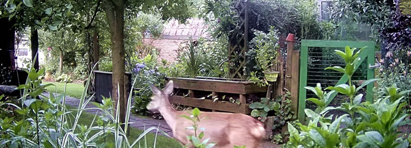 Reh in den Goorn, jüst op den Hortensienbusch to.