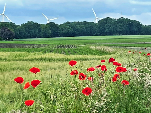 Blots so üm un bi twee Dutz Mahnblomen hefft an en Weegkant all de Ackeree överleevt un blöht nu ganz ahn Subventschonen as dull. Dat Glanzlicht op mien dääglich Spazeergang. Un wenn een de ’n beten passlich in’t Bild setten deit, denn maakt de düchtig wat her.
