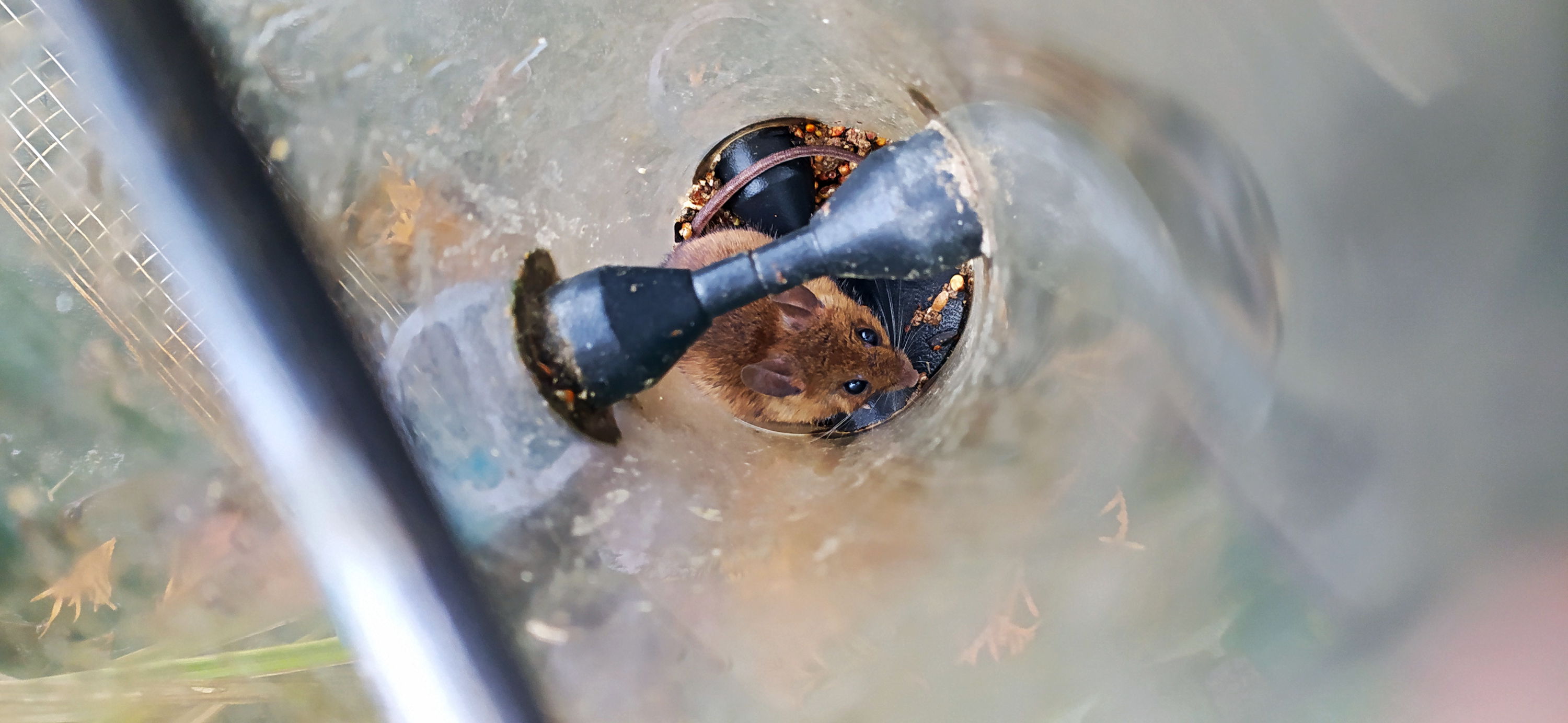 Hüüt wull ik nafüllen, de grote Röhr sehg meist lerrig un togliek teemlich schietig ut. Hm, is ja ok Schietweder, mal kieken. Nanu, is de gor nich lerrig? Dat Plastik schient vun binnen beslaan. Dor beweegt sik wat! Is en hungrige Lünk etwa dör en Foderlock sluppt? Dor passt de doch gor nich rin?! Ik mutt baven den Deckel opmaken.