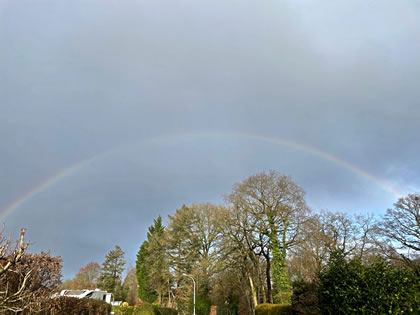 Na en avendlich Gewitter bi deep stahn Sünn wies sik gistern een vun de intensivsten Regenbagens, de ik sehn heff. Knipst heff ik em dör de Schiev. De twete Bagen is ok good to kennen (in't Foto links). De Regen driev noch in fiene Wulken in den helleren Ruum in't Bagenbinnere. En Bagen, de sik sehn laten kann, meen ik. Dat Bild köönt