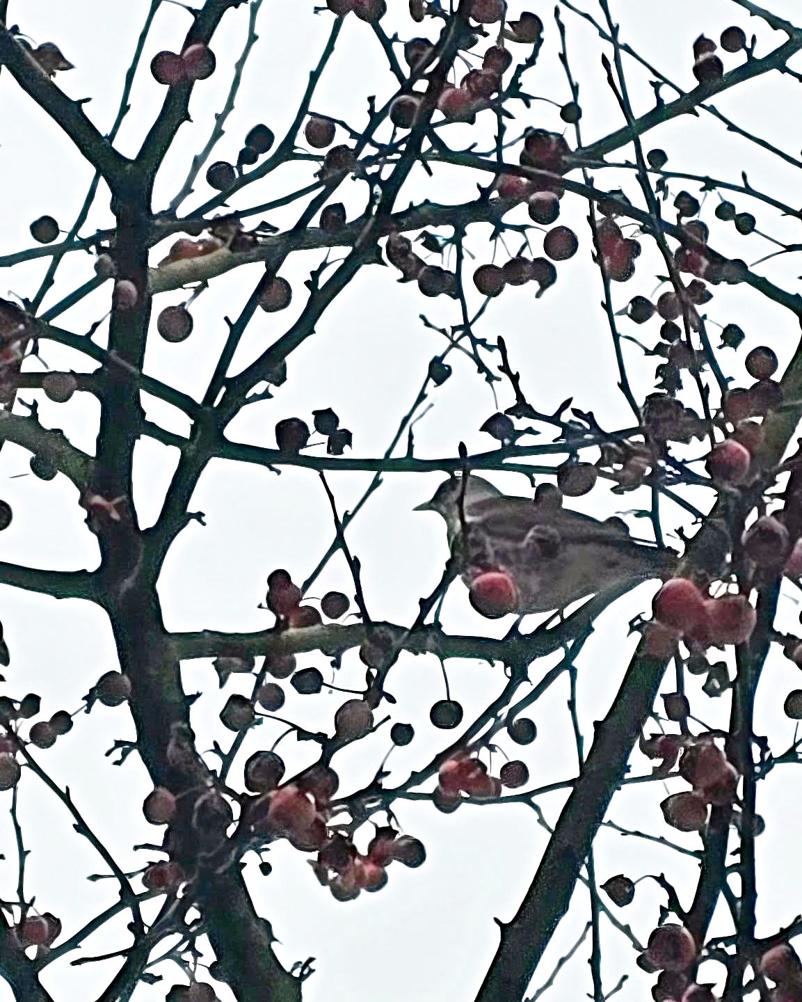 Twüschen de kahlen Telgen sitt en Singdroßel. Ehr Bost is sprenkelt as oles Pergament; ehr Sang is en Speel ut Wedderhalen un Variaschoon, as wöör he sik in den Morgen rinflechten. Twüschen de Strophen tuckt se an en Beer, man de is to hart un fallt dal. De Droßel kehrt sik dor gor nich an un singt wieder. Dat Licht warrt heller, de Dag fangt an. De Vagel grööt den Lent, de liesen kümmt. Dat Bild köönt Se per Klick vergröttern! Jasmin Apcin