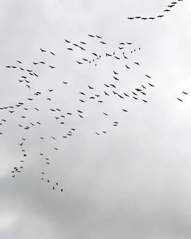 2.11.25 ...Se fallt vun'n Himmel Al jümmers hebbt de Toogvagels mien deep Bewunnern hatt. Düsse enorme Moot vun de lütten Deerten, düsse coole Kehrdiannix, düt entslaten Weltbörgerdom! Nu grasseert de Vagelgripp, un wi höört: De Kranen fallt dood vun'n Himmel. Se fallt vun'n Himmel!! Ik kann gor nich seggen, wo mi dat dat Hart ümdreiht. Wat heet dat denn? De Vagel weer al krank; se föhl sik swack un elend, binnerlich ahn Knööv un Höpen, allens dä ehr weh; un liekers, as de Swarm loswull mehr as een sachs ok süük , hett se sik ahn Sülvstmitleid oprafft un is mit letzt Kraft opstegen, wieldat se föhl: Ik mutt flegen! Un mit mien Swarm! Jedeen Flüchtenslag dä ehr weh, man liekers is se in de Luft bleven, bet se meist dood weer un eerst in't Dalstörten is se doch sturven. Dat sünd de Deerten, de uns vör de Fööt fallt. Dat is ehr Charakter. Jaja, kannst seggen: Dat is bloots ehr genetisch Programm! Na und?! Ik kenn keen Minschen, de so is. Nich vun Charakter noch vun genetisch Programm. För mien Bewunnern heff ik keen Wöör mehr, un mi kaamt jümmers de Tranen, wenn ik an denk, wat düsse Deerten Gewaltiges leisten doot. Se kaamt wirklich vun'n Himmel, un an'n Himmel to starven, in frien Floog, is de triumphale Afgang, den se verdeent hebbt. Mien Hart höört de Toogvagels to. Marlou Lessing