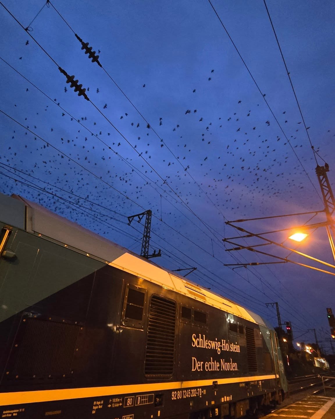 Jedeen Avend in düsse Johrstied: grote Swarms vun Dohlen un Kreihn. Jüst nu even ok en lütte Göös-Formaschoon. De Göös treckt bald weg, avers de Dohlen un Kreihn blievt hier un bildt liekers de groten Swarms, sünnerlich avends, denn se slaapt alltohoop in grote Kolonien. So sünd se sekerer vör Fiende. Mennigmaal slaat sik Toogvagels dorbi an. Opnahmen in #Elmshorn blangenbi: #supernormal (all hier hebbt en Vagel en coole Ort för en Nest!). De Biller köönt