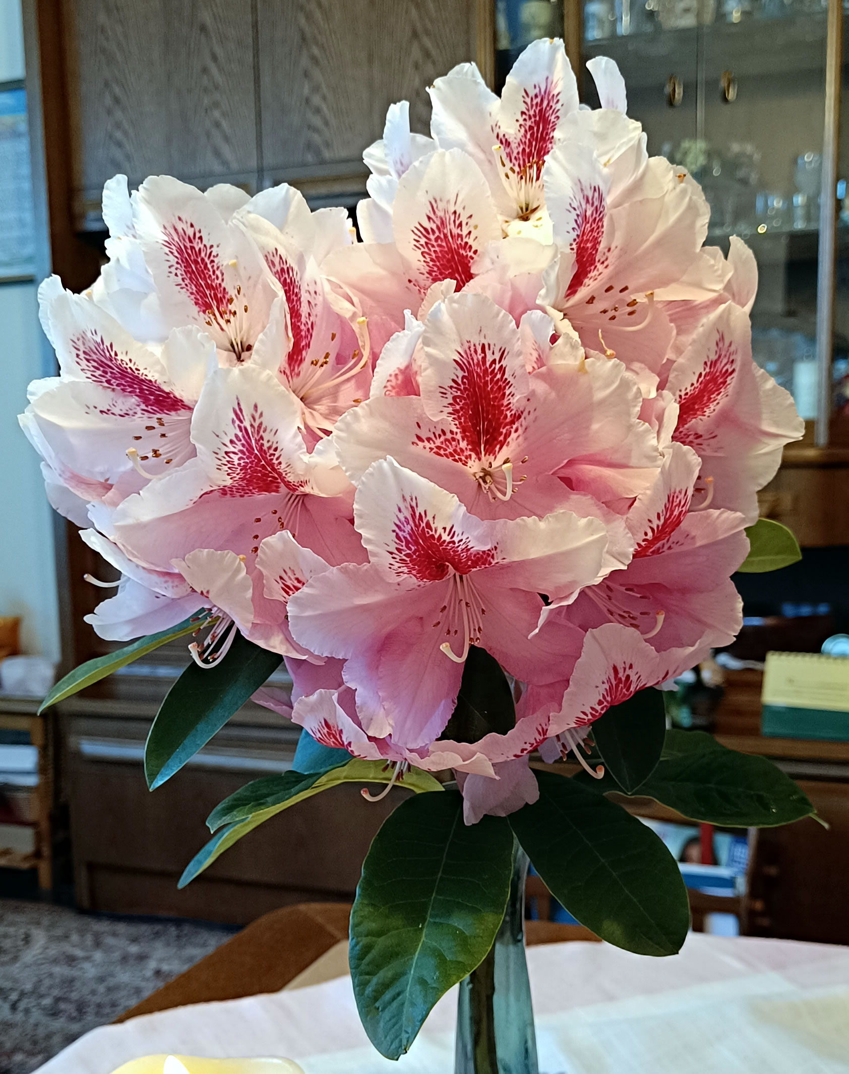 Nameddags bröch mi mien Naver en hartföörmig Rhododendron-Telg, den he an'n Borrn funnen harr he weer dalfulln. Ik steek em in en slanke Vaas un na en halve Stunn harr de Telg de Vaas utdrunken! Ik heff glieks Water naschüddt, un ok dat hett he döstig opsuugt. Dat dreiht mi dat Hart üm. Wenn't nich bald Regen gifft, wat schall ut de Natuur warrn? Dat Bild köönt Se per Klick vergröttern! Gertrud Everding |