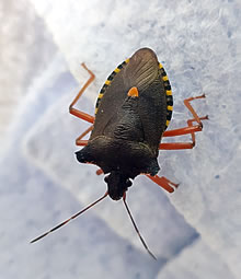 Dör mien apen Baadstuvenfinster is se rinseilt de roodbeente Boomwanz, een vun uns gröttste Wanzenaarten, sachs op de Söök na Fuchtigkeit. Landt is se denn ganz richtig in mien Baadwann, 'neem noch Waterdrüppen hüngen. Ik heff ehr behott wedder na buten in't Gröne verfracht. De smucke Wanz mit den orangen Fleck, de roden Been un den lustigen Punktrand driggt en dunkel Bruun dat is ehr Harvstkleed, lees ik na; in'n Sommer is se heller. Oha! Warrt Harvst, Lü! De lütte Wanz weet dat al vör uns. Dat Bild köönt Se per Klick