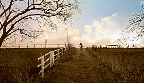An de Radweeg op't Land sühst faken Verkehrsteken as "Radwegschäden" oder "Radfahrer absteigen", de al gröön vun Moos sünd, also siet Johr un Dag dor steiht. Högen kannst di ok över en Schild mit'n Liekutpiel, dat oppen Diek steiht: links de Stroom, rechts de Wischen, oder en Afbeegpiel, de di na dree Metern batz oppen Acker schickt. Enn vun'n Radweg!