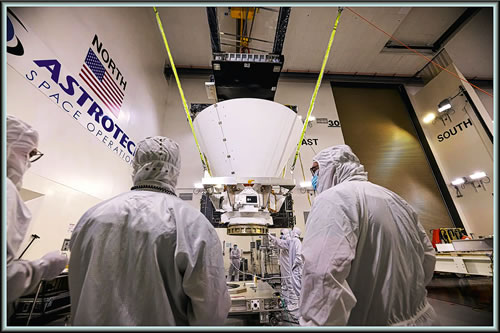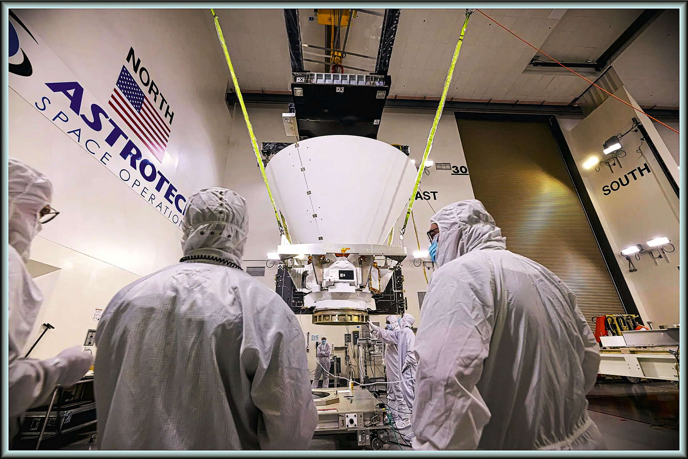 Düt Bild wieset Arbeiters van BAE Systems. Sei arbeitet an'n 16. Januar an dat SPHEREx-Observatorium van dei NASA in dei Astrotech Space Operations Facility up dei Vandenberg Space Force Station in Kalifornien. Dei Mission, dei an'n 8. März 2025 upsteeg, schall den heelen Hemmel in dat Infrarotlecht korteiern. "Dat bröchde us för eine Tied dörnanner", sä Gary Melnick, ein Astronom an dat Zentrum för Astrophysik (Harvard & Smithsonian) un Maat van dei SPHEREx-Mannschkup. "Mit dei Tied kömen wi dor achter, dat SWAS Waoterdamp in dünne Laogen duune an dei Baobensiete van Molekül-Wulken fünd; dat bedütt, dat et väl mehr Waoter in dei Wulken gäben kunn, dat at Ies inschlaoten is." Disse Idee van dei Mannschkup geef einen Sinn. SWAS fünd minner Suurstoffgas (also Moleküle; dei bestaoht ut twei Suurstoff-Atome), at man dachde. So nöhmen sei an, dat dei Suurstoff-Atome an dei interstelloren Stoff-Körnkes kläwden un denn mit Waoterstoff-Atome tau Waoter tausaome güngen. Läötere Forschkungen wiesden, dat sei recht harn. Dei Wulken-Moleküle wörn ein Scherm gägen dei kosmischken Straohlen, dei süß dei Verbinnungen uteinanner bräcken dön. So harn Waoter-Ies un anneret Materiaol deip binnen in dei Wulken einen Schutz. Wenn dat Sternenlecht dör eine Molekül-Wulke schinnt, verschluukt Waoter-Moleküle un Käöhlenstoff-Dioxid-Moleküle wisse Lecht-Wellenlängten un maokt so eine dütlicke Signatur. SPHEREx un WEBB käönt dei mit ehre Spektroskopie-Technik utwerten.