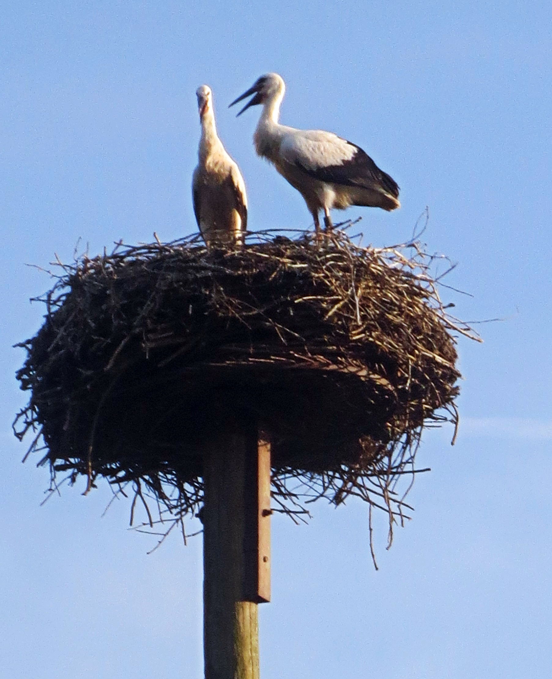 De Oostertied is vörbi. Nich blots de Oosterhaas hett Eier „leggt“, ok uns Störk sünd an't Bröden. Dat ward nich mehr lang duurn, denn ward de lütten Störk slüppen un jümehr Snäbel na Foder opsparrn. Nu, in de Hauoornt, seht wi dat Poor meist jeden Dag twüschen de Hauhümpels na Nohren söken.