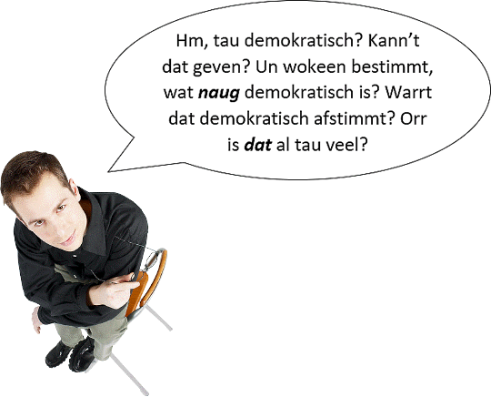 Behrend Böckmann Dor läs ik, dat unse Demokratie nich ganz so gaut is as dei Demokratie inne Schwiez, wer bäten bäder as dei Demokratie inne Vereinigten Staaten. Un dat wull nich blot wägen dei Dodesstraf in den einen un annern Bundsstaat dor. Nå 75 Johr Demokratie in'n Sinn'n von uns Grundgesetz sünd wi dor ankåmen, dat vör luder Demokratie dei Äsel up't Ies danzen geiht, nå Goethe dat Demokratiespäukel taun Hexenmeister wür orrer dei Pier dörchgåhn, wenn dei Kutscher dei Tögel tau locker höllt.
