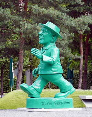 Dorvon harrn denn por Börgerrechtler dei Schnut vull, sei wullen 'n annern, 'n frien Osten un güngen mit Lichten up'e Stråt. Dei friedlich Revolutschon geiht wieder, dat kümmt sowiet, dat dei beiden Düütschland wedder ein Düütschland warden. Dei Treuhand rümt up, hålt rut, wat ruttauhålen is, dei dummen Ossis gåhn stempeln, Upbuhelpers kåmen gägen 'n Buschtaulåch ut'n Westen in'n Osten un säuken sik so näbenbi 'n Wådergrundstück, 'n niege Fru, Immobilien, Holt un Lännereien... Un man brukt ok por Lüd ut'n Osten, dei mitmåken, un binnt por Blockfläuten un por vonne nie grünnt SPD un Lüd vonne Runnen Dischen in'n niegen Apparat in. Jeder Ostdüütsche kann sik jeden Dach 'n Banan leisten un künn ok up Malediven dükern un schnorcheln, wenn hei denn nich blot dei Handlanger för dei tauwannerten niegen Bwersten wier.