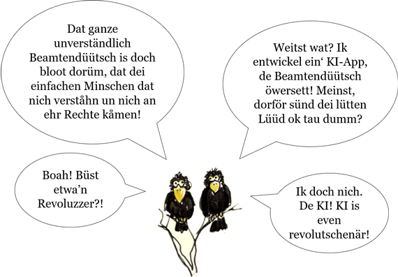 Un man denkt an all, an Frömde un an dei, dei allein 'n lütten Wörm uptrecken möten, wägen 'n Krankheit nich arbeiden dörpen orrer mit Schrift un Språk noch nich so ümgåhn, dat's 'n Formular läsen, verståhn, utfüllen un anne richtige Stell afgäben orrer inreiken knen. Un nich all sünd so kunnig, dat's weiten, up wecker Amt orrer in wecker Inrichtung dei minnerbemittelte Minsch 'n Andrach up Wohngeld un Hülp taun Läbensünnerholt, up 'n Tauschuss ut't Billungspaket för Schaulsåken, för Kinnergeld, Kinnertauschlach, Öllerngeld, Muddergeld, den Ünnerholtsvörschuss un dat "Teilhabe"-Geld, up Geld för 'n Schullenberadung un 'n Inkopsschien för dei Tafel, för 'n Mudder- un Kindkur un anner Hülp stellen möt.