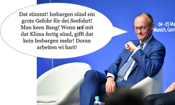 För all disse Poletikers, dei sik hochmäudig, hochnäsig, inbillt un åpig gäben un vör nix Manschetten hemm' un sik mit ehr Daun dick daun, gellt wull dat Bibelwurt ut'e Sprüch Salomos' (Kap. 16, Vers 18): "Stolz führt zum Sturz, und Hochmut kommt vor dem Fall!" Wecker tau hoch sticht, dei kann ok deip fallen, em orrer ehr dat so gåhn as dei "Titanic", dei för "unsinkbor" hollen wür, denn mit'n Iesbarch tausåmenstött, inne Nacht von'n 14. taun 15. Prilmånd 1912 binnen twei Stunnen un vierdig Minuten ünnergeiht un nu ümmer noch 3800 m deip up'n Grund von'n Nuurdatlantik licht.