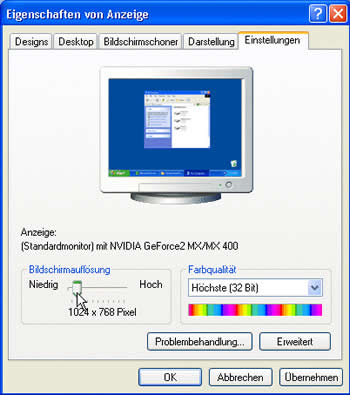 De Billschirmoplösen, de vundaag begäng sünd, sünd: 800 x 600 (dat heet: 800 Bildpünkt breed, 600 Bildpünkt hooch) för lütte Billschirmen mit 15 Zoll Billschirmdiagonale. 1024 x 768 is de Standard för 17"-Monitoorn. Op 19"-Monitoorn köönt Se al 1280 x 1024 Bildpünkt good wiesen laten. Wat dat mööglich is, hangt avers vun de Grafikkoort un vun de Farvdeepde af, de Se instellt hebbt!