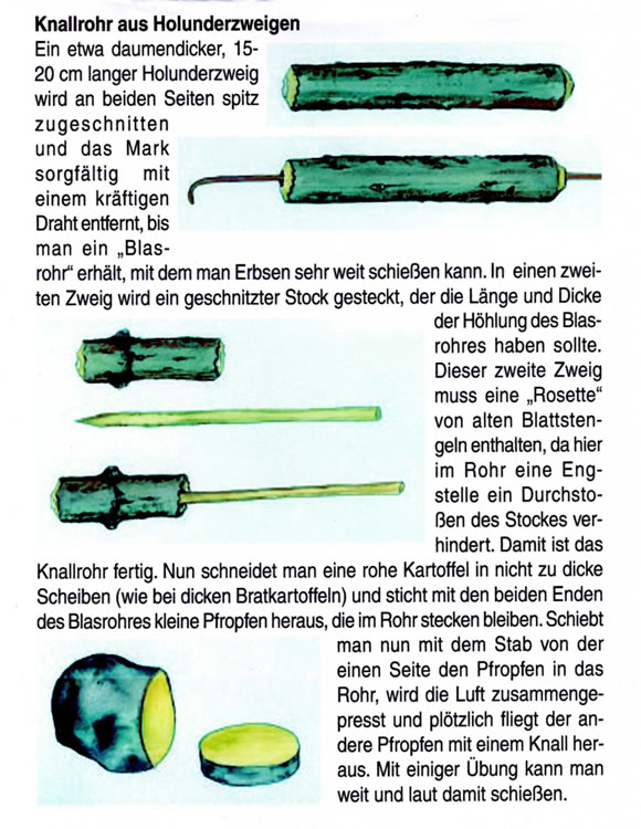 Ballern müßten uns Vörfohren aver ok schon. De legen Geister müßten verjaagt warden. Mennigmaal weern de bösen Geister Kreihen, de in ehr lüttes Koornfeld groten Schaden anrichten kunnen So luud kunnst nich klatschen as de Ballerbüss knallte. Ünnen steiht dat in Hochdüütsch, woans en Ballerbüss funkschoneert, bloots beten falsch, denk ik. Een bruukt een graden Ast vun'n Holluner. In de Midd hett hei een runden Markstrang. Den müßt mit Haken un Ösen rutpulen. Denn schnitzt di ut Bäukenholt een nau so runden Stöter as de Markstrang dick weer. Dat kregen uns Vörfåhren mit Splitter vun Füürstein, wi mit Glasscherben hen. Dor kannst allerbest mit höveln, wenn dat kannst. Wenn de Stöttel dörch dat Markloch flutschte, kunn beten Smalt dat noch verbeddern, dat Flutschen un dat luftdicht Afdichten. Baven lett een an't Enn en afrundet Holtstück stahn. Un nu aver: Nix vun Kartüffel. De kennten se in de Bronzetiet un wat fräuher nich. Dat eenzig, wat helpen kunn, weern de dicken Wöddeln vun Mareddig. Den kunnst ok bi Froostweder ut de Ierd hålen. Vun disse Mareddig-Wöödel snittst kielige Proppen, wat grötter as de Markstrang. Mit den Kopp vun den Stöter, den Stötel-Knauf, kloppst de Mareddigproppen vörn un achtern in dat Markstrangrohr. Denn settst den Stötelknauf di vör de Boost, mit beid Hannen höllst den Holunnerast dörvör. Und denn mußt mit Kräfft un mit'n Ruck drücken. Die Luft in den Markstrang ward tosamenpresst, wenn du up de Vöddersiet den Mareddigproppen dicht un fast rinhaugt hest. Dunner, dat kann en Knall geven! Mit de Hannen klatschen is gor