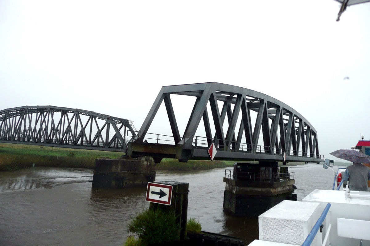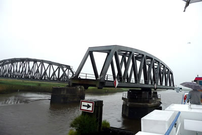 De Slüüs vun Nordfeld harr blots een Kamer vun 65 Meter Länge. De Breede weer blots 9,50 Meter. Dor sull nu de "Adler Princess" dörch! Se hett dat aver mit Hölp vun de Schippskru schafft. In Oeltüüch passen se buten up de Slüsenmuur up un maken de Tampen fass. De "Princess" dörf doch keen Schramm kriegen! De Slüsenkamer weer so knapp bemeten, dat wi de Slüsenmuur mit de Hand anfaten kunnen. Dat hett uns aver de Kaptein ünnerseggt. Na de Slüüs veränner sik dat Land. Wi verleten de Masch. De Eider slängel sik dörch dat Land. Wi wöörn to dat anseggte Brunchbüffet upropen. Dat leet uns dat slecht Weder vergeten. Na en groten Bagen vun de Eider düker dat Storchendörp Süderstapel up. Dor stüür uns Schipp den Anlegger an un leet Lüüd utstiegen un niege Gäst kemen an Bord. Na en korten Stopp güng de Fohrt na Rendsborg wieder. Dorvun vertell ik opneegst.