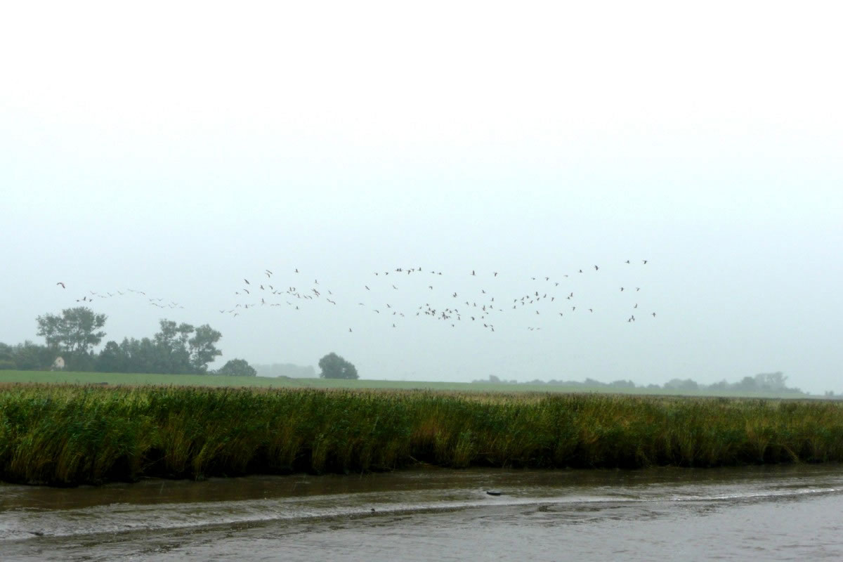 Seker stüür de "Adler Princess" dörch de apen Brüüch un uns Fohrt güng wieder in Richt na Rendsborg. Rechts un links vun uns swappen de Wellen gegen dat Över. Hier harr de Eider noch enen richtigen Diek. Up den Diek grasen de Schaap (lebennig Rasenmeiher). An Heven trocken mit Gesnatter Graugöös neven uns ehr Bahn. Achter uns verswunn in den griesen Heven de Kirchturm vun Tönning.