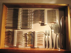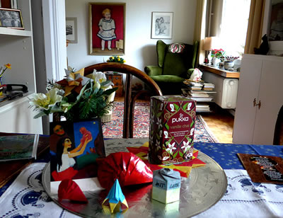 mehr. Beten Klöterkraam an'n Schrievdisch un de Kökenschuuvlaad