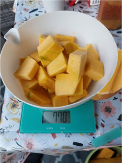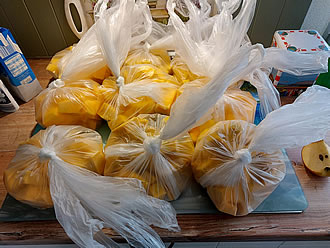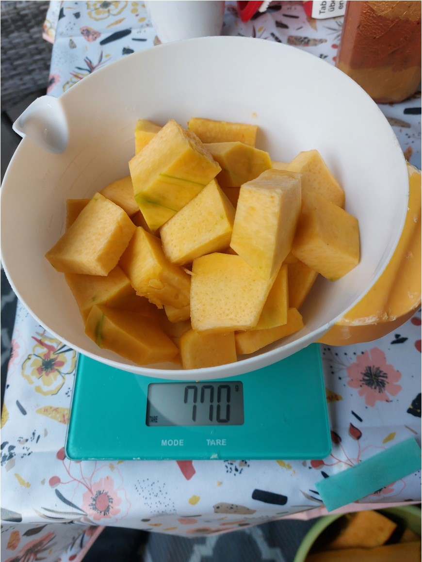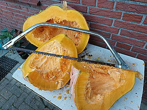 Un nu heff ik sülven so een aarnt. Nee, en Zentner is dat nich, sünd bloots 31 kg, aver liekers. En ganzen Vörmeddag bün ik an't Snieden, Breken, Schälen. De Körbs warrt porschoonswies afwagen un inlagert.