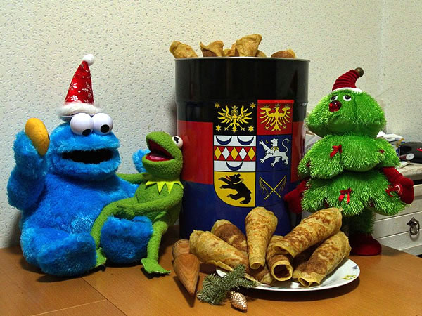 Rullerkes sünd dünne Waffeln, de wi in Oostfreesland sünnerlich to Niejohr backt. Hier links sühst mien Waffeliesen, dat en Oostfresenwappen in de Waffel präägt sowat mutt schon sien. De Rullerkes mööt direkt ut dat Waffeliesen hitt oprullt warrn un sünd so lecker, as se duften doot (in den Deeg kaamt Kardamom un Anis). Erinnern warrt wach an Gäste un Besöök; mien Papa hett dormalen de Rullerkes akribisch op de Heizung leggt, dat se schöön kross bleven se dröfft nich to week warrn. Mien Mama hett em denn jümmers maken laten, den ganzen Vörmeddag, dor weer he in sien Element. Thomas Seemann Wi hebbt de Spitztütenwaffeln "Neejörkers" nöömt un elkereen wuss, wat dormit meent wee ... Een Twintich-Liter-Melkbum wee jümmers vull mit Neejörkers, wenn us Moder de Deech dör de Neejörker-Paan stüürt harr dat "Rullen" över d' "Spitzhollt", dat wee denn jümmers de Kinnerpaart in de Wienachtsbakkstuuv ... Ikk hevv vandoach noch (goode) Buukpien van toveel Neejörkers verkasematukkeln, wenneer ikk blods dran denken do ... Ewald Eden |