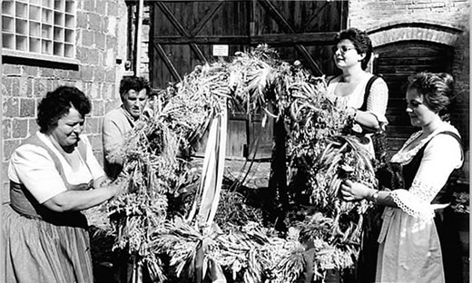 Wokeen de letzte Föhr mit Weiten na'n Hoff bröchte, kreeg de vun Fruuns schöön smückte Oornkroon. Se föhrten bi de Veranda vun dat Gautshaus vör. Alle Fruuns- un Mannslüüd stellten sik in en Krink up, veele harrn de Staakfork, de Seis orrer en Hark dorbi.