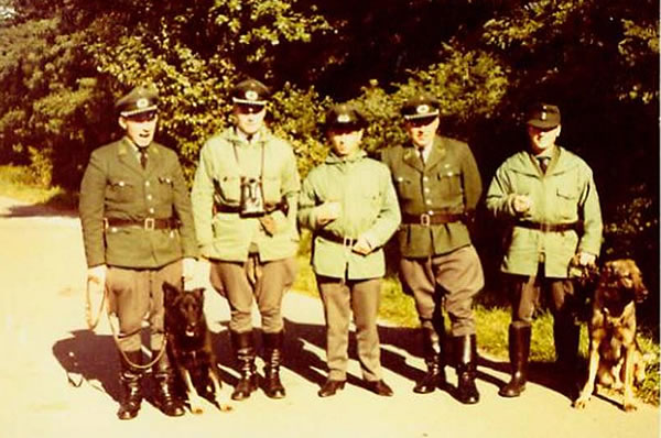 Rund üm dei Klock lepen wi dörch Wald un Feld. Natürlich föhren wi ok mit den Streifenwagen. Opmehrst hebb ik mi höögt, wenn wi mit twei Beamten Fahrradstreife längs dei Grenz maakten. Dat wiern herrliche Summernachten in den Reichswald. Ik segg man bloots Natuur pur. Natürlich hemm wi domols ok al Funkgeräte hatt. Ja, ok o Fohrradstreife. Unsen Komissar hett jümmer enen Deinstplan maakt. Hei müss uns ja ok mal in dat Gelände finnen. Dor wieren denn jümmer so bestimmte Punkte benöömt. Üm dei un dei Tied müssten wi dor sien. Mit den Streifenwagen föhrten wi ja so mit vier orrer fief Beamten op Streife. Ik heff denn den Kombi fahren müsst. Ik wier Stammfahrer. Denn sett ik an den Dag enen Kollegen an enen bestimmten Punkt af un haal em so nach twee Stünnen so 3 bet 4 Kilometer wieder wedder af. Nachts jümmer mit twei bi enn. Bloots en Hundeföhrer güng alleen. Dei Kombi stund denn jümmer beten in dat Hinterland. Unsen Kommissar keem eenmol of tweemol inne Woch op Kontroll. Ut dei Tied is mi ein Begäbenheit noch in Kopp, dei bi den Fachunnerricht, alle drei Wochen, tau Spraak kamen is. Een Kolleeg hei is ok op dat Bild hett sich bi enen Buer so'n Ballen Stroh packt, hett den so 50 Meter mitnahmen un sik dat achter den Busch op dat Stroh komodig maakt. Dei holländischen Buern möten in't Oog behollen warrn. Sei bröchten Schaap illegal na Düütschland. Uns Kolleeg seet dor fein ut den Wind. Hei schlööp in.
