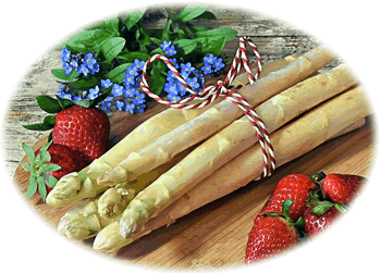 mit Speckstipp, Spargel ut'n Goorn un Koppsalat mit de lütten