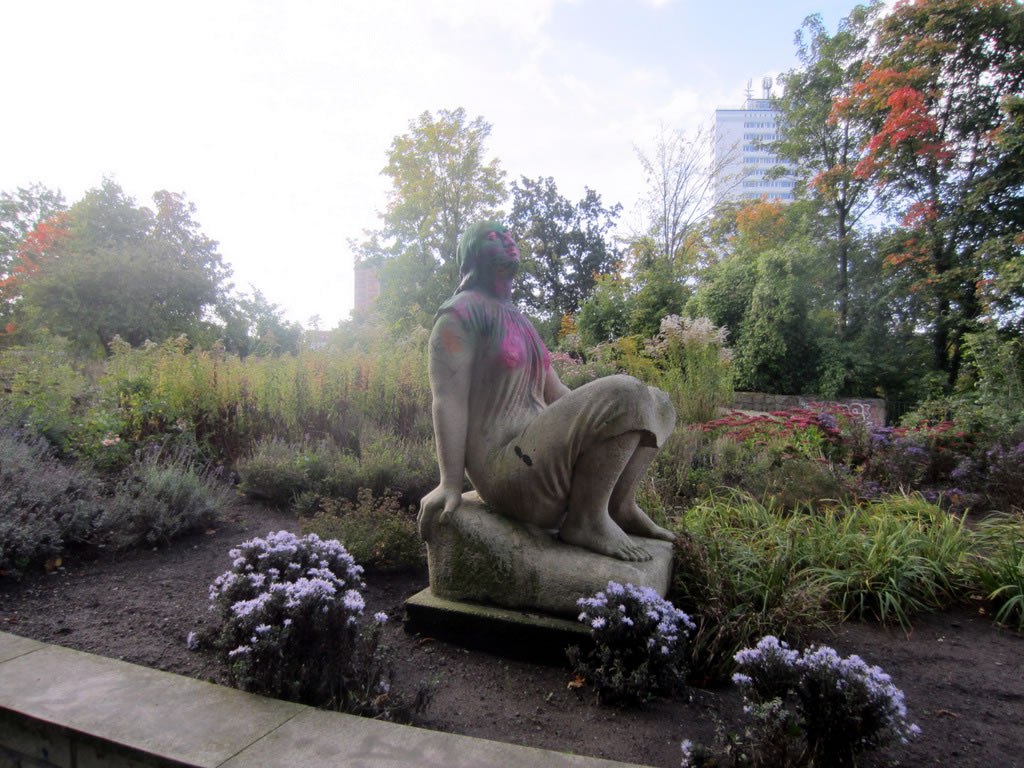 Doch dei farwbeschmeerte Frugensskulptur in dei schöne Blaumenrabatt'