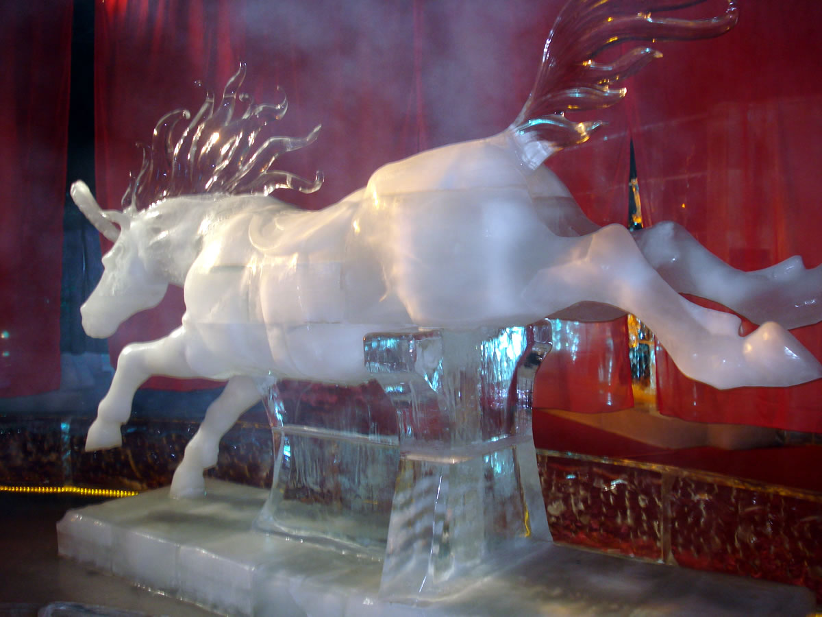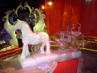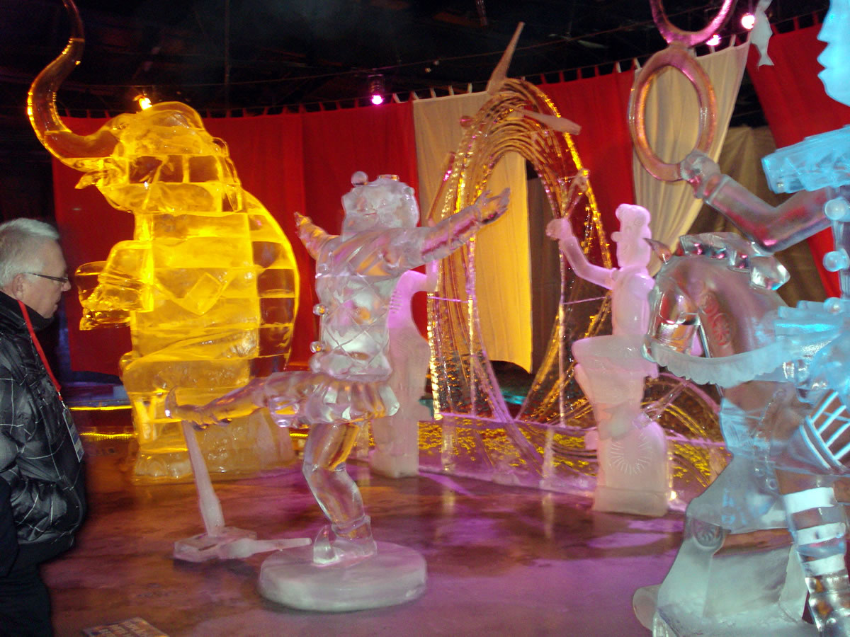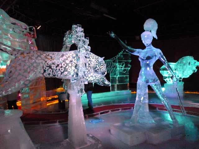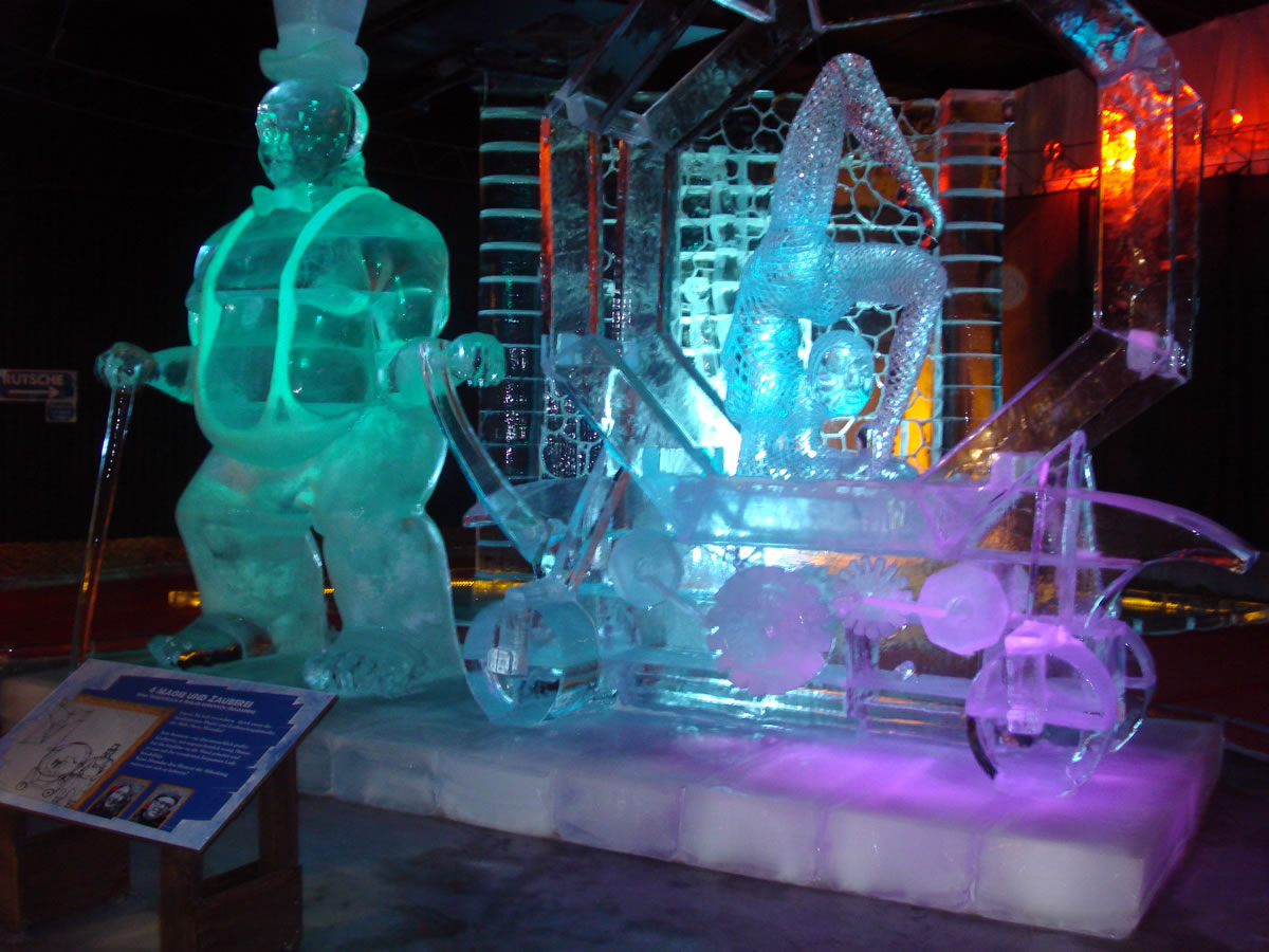 In dei Mitt grient mi, uprecht stahend, eine sihr korpulente Soeg an. Mit dit Karussell tau führn wagen nich mal dei Görn. Wecker will ok einen kollen Nors kriegen? Ick begäw mi in Richtung Utgang, wiel ick richtig dull verklamt bün. Faststellen möt ick, dat disse Ieswelt noch schöner is as dei von 2011. Ut jede Iesskulptur, egal ob ut witt Ies orrer dörchsichtig Ies, hemm' dei Künstler ut Russland, Ukraine un Polen allens akribisch ruterarbeit't, wat jede Figur an Fienheiten bloten hemm' kann. Bloten schad', dat disse Kunst äbenso vergänglich is as dei Sandskulpturen. Dei Besäuk hett mi gaut dan. Hart un Seel' hemm' uptankt, wat in disse Johrestiet bannig nödig is. Dat wi Krink-Frugens nastens uns bi Kaffee un Kauken upwarmen daun un noch unbedingt Geld utgäben möten, gehürt tau dissen Namiddag un is woll ok tau dei Verkopsstrategie von Korl.