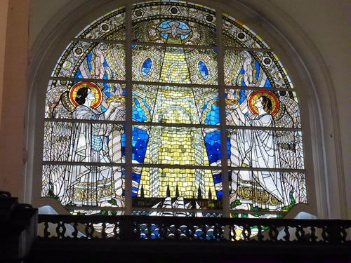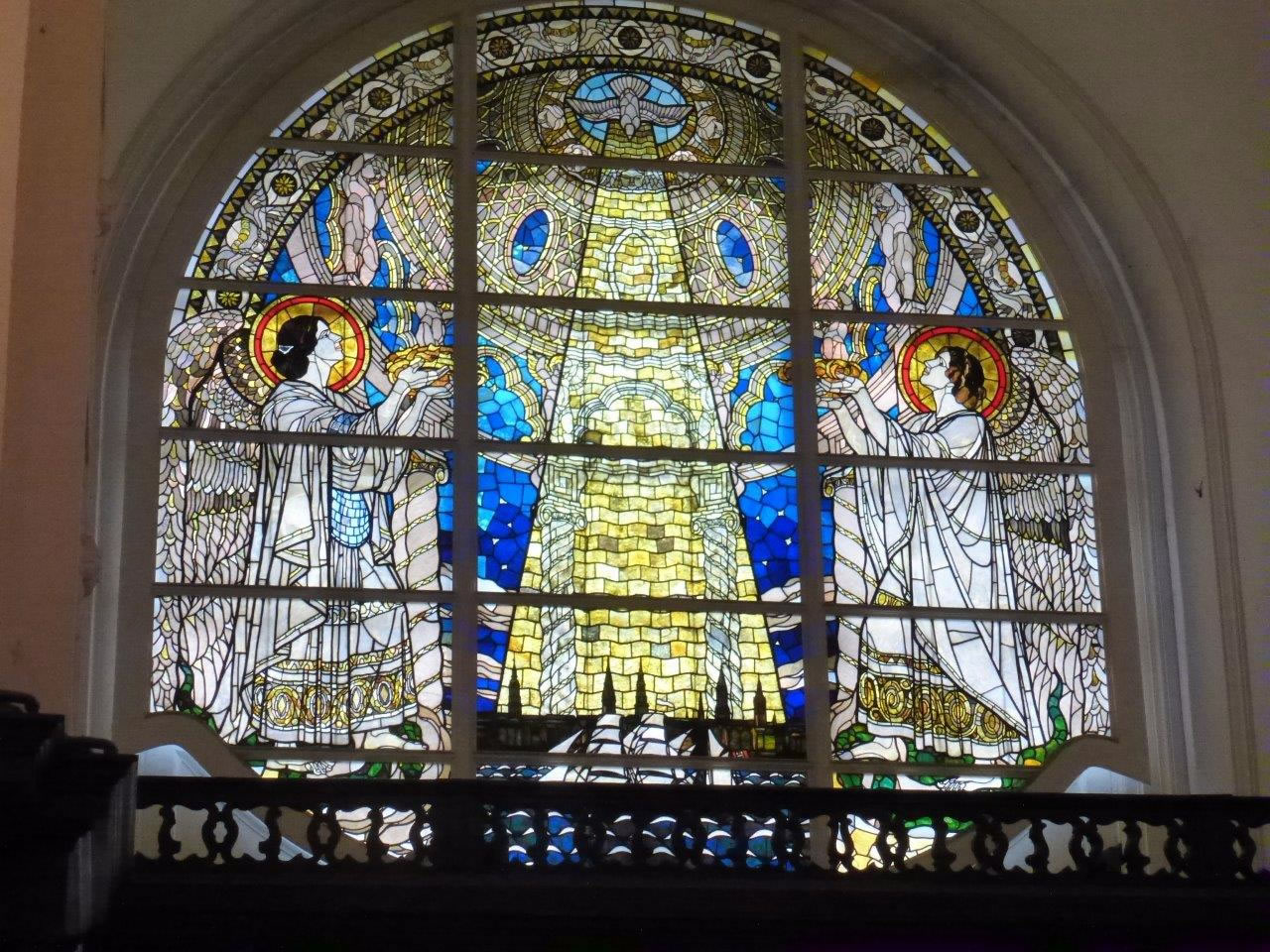 Glasfinster, hier över dat Hauptportaal. Alle annern Karkenfinster
