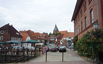 Hüt will'n wi na Mölln. Von'n Bahnhoff ut kümmt man tauierst dörch de niegere Stadt mit de Geschäftsstrat un einen Marktplatz mit Brunnen un Sporkass'. Dat is oewer nich de richtige Stell för eine Stadtführung, denn de beginnt up den'n historischen Markt bi Till. Bet de losgahn deit, is noch Tiet, un so finnen wi einen schönen Platz vör dat Ulenspeigel-Museum un äten Middach. De Priese hemm' dat in sick, oewer hier sünd Gehälter un Renten jo ok höger. Wi leisten uns bloten eine Kleinigkeit, de sick oewer as grote Portschon entpuppen deit: Toast mit Putenfilet, Beern, Kronsbeern, allens mit Käs' oewerbacken. Dat is ein schönes Gericht un makt richtig satt.