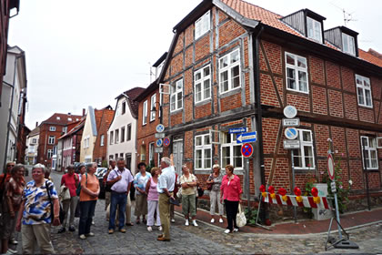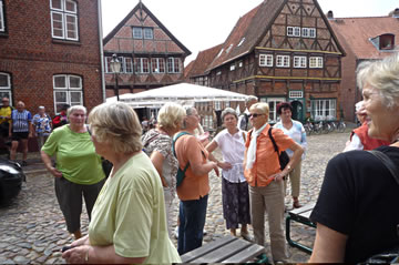 "Können Sie mir sagen, was das Altarbild bedeutet?" "Die Heimkehr des verlorenen Sohnes." "Du hest dat richtig seihn, Ingrid." Ingrid wier'n de Männer up dat Altarbild upfollen, Chrisching un ick könn'n nich so wiet kieken. "Die Frau in blauer Kleidung soll wohl Maria sein?" "Nein, das ist nicht Maria, die Dame in Blau ist die Stifterin des Gemäldes und verlangte, mit ins Bild gesetzt zu werden." Sei passt eigentlich nich in dat Bild, allein von de Kledaasch her. So seih ick einmal wat ut de Bibel un einmal wat ut dat Middelöller. Sei hett sick in't rechte Licht setten laten un springt mit de kräftigen Farb'n bina ut den'n Billerrahmen. Liekers is dat Bild siehr schön un einmalig. Wierer vörn föllt uns ein Gestäuhl up, dat mit wunnerschöne Ornamente smückt is, un dorin find't man uterdem de verschiedensten lütten Männerköpp. De Köstersch verklort mi, dat de rieken Solthändlers dor säten hemm'. Sei broechten tauierst oewer Land dat Solt ut de Heid' na Lübeck, dorna up de Stecknitz, de tau den'n iersten Kanal utbugt worden wier. Hüt is dor de Elbe-Lübeck-Kanal. Dor sünd wi von'n Verein ok all wäst. Mihr dorvon hürn wi bi de Stadtführung.