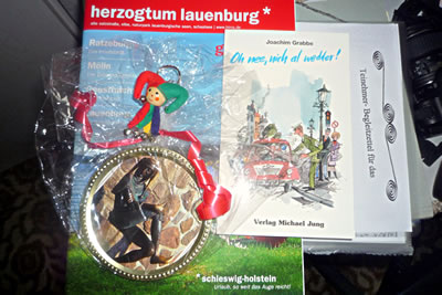 De Marktwirtschaft bewiest dat mit väle Souvenirs, Ansichts- un Kunstpostkorden. Ulenspeigel-Festspäle finnen up den'n Hauptmannshoff statt. Ut de Informationsblärer un Broschüren, de ick mi köfft heff, kann ick noch allerhand lihrn, denn de hemm' ein gaudes Niveau. Ick kam werrer, bestimmt! Tschüßing, Mölln! Tschüßing, Till! Ick möt di doch noch eins straken un heff denn werrer einen Wunsch frie. Tschüßing! |