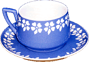 dat mien blåge Tass mit den dekorativen Bläudenrand üm