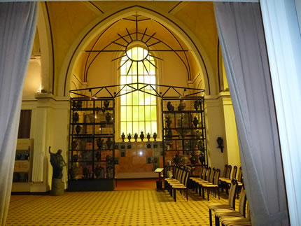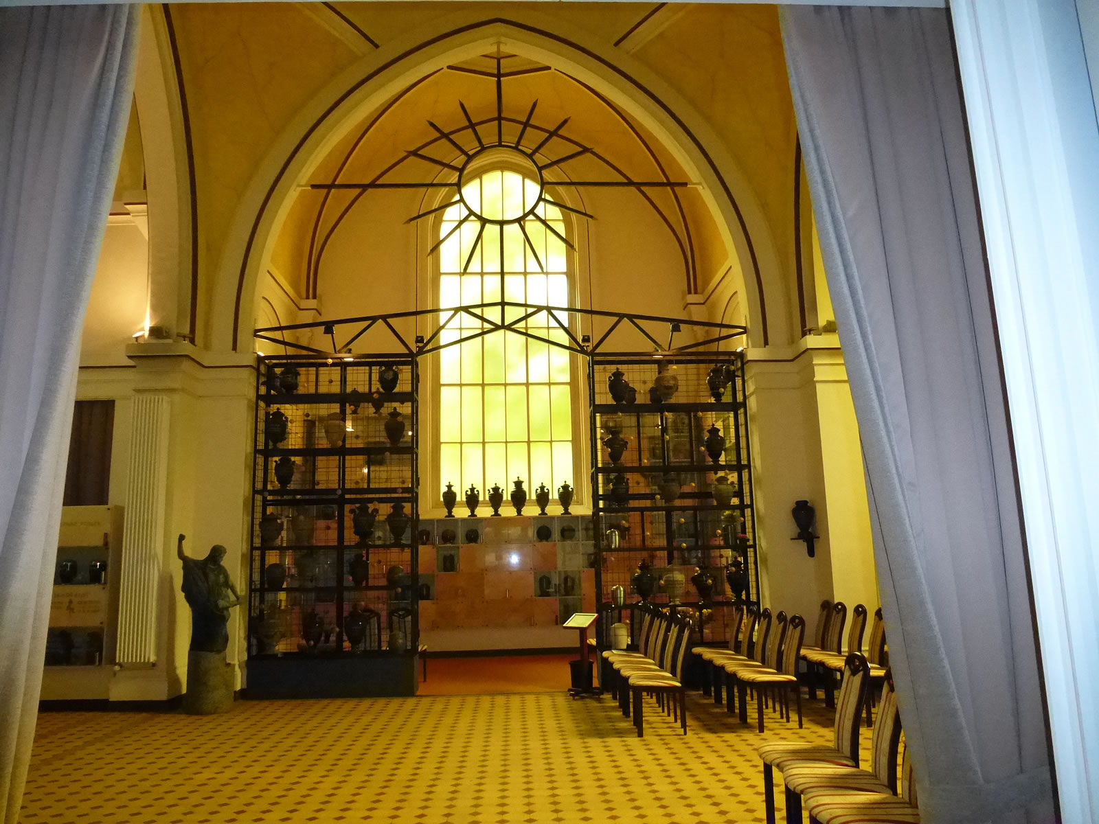 Kapelle 8! Utstiegen! Hier is dat Kolumbarium! En grote Kapell för Truuerfiern. Aver allens stunn vull mit Glasvitrinen, mit Namens anschreven, un Urnen överall Urnen staatsch un opwennig! Richtig fierlich! Grootoordig, so'n Anblick! Aver ok düster. Na ja, wokeen dat mag, de mag dat mögen. Is ok nich ganz billig! Aver de Urne mutt denn nich in de Eer rin.