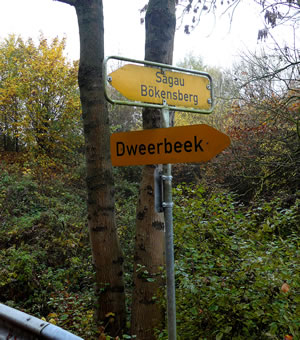 un links vun uns weer dichten Woold. Wegwieser na Sagau möken