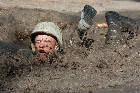 Neven dat "Formalutbillen", wor man to'n Bispill dat Marscheern un Gröten lehrn dä, güng dat meist jede Dag in 't Övengelänn. Mit vulle Marschkledååsch, Ståhlhelm, Rucksack, Gasmaske ... ääh, wat segg ik dor, ABC-Schutzmaske, un vör all'n de Suldåtenbruut, dat Gewehr "G3", fief Kilometers hen, middåågs fief retour, nåmiddåågs wedder hen, åvends wedder torüch, un jümmers mit 'n Barg Schikanerie dormang. Hüüttodåågs heet dat "Aufsitzen!", un denn warrt de Suldåten mit 'n "Nato-Zeeg" hen un her fohrt. Eens Nachts, Klock twee, heter dat: "Alarm, Alarm all'ns ruttreden, in vulle Marschkledååsch, Alarm, Alarm!" Ja, un denn stünn en Dörtig-Kilometer-Nachtmarsch op dat Programm, mit Ziel Övengelänn. Låtens nu kunn een faststellen, wat de Stevels, ok "Knovelbekers" nennt, woll passen dän. Mit 'n Barg Blåsen an de Fööt keem de Bagååsch denn nå acht Stünnen nå'n Övenplatz. Hier müsst sik denn jedereen eerstmål 'n Eenmannlock buddeln, dornå heter dat "sammeln", un denn worrn de jungen Minschen dörch't Gelänn jågt, bit se an een'n twindig Meters breden Striepen kemen, dee de Panzers, dee hier op un dåål rötern dän, to'n depe Matschspoor ümplöögt harrn.