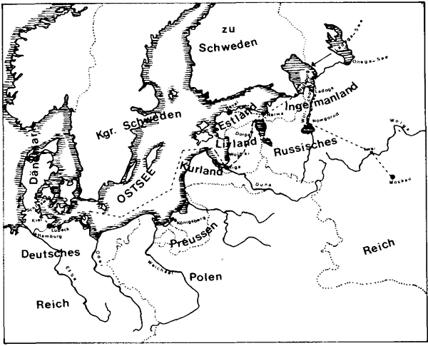 De Schippsreis güng an 9. November in Travemünn los. Bi groote Küll un dichten Nevel kemen de Mannslüüd mit ehrn hölten Dreemaster na fief Daag up See in den iesfrien Haven vun Riga an, wat nudaags 'n sweedsch Stadt weer. De Sween harrn to de Tiet ganz Livland, Estland un ok dat Ingermanland ünner ehr Knutt. As dc Packelaasch up eenundörtig Sleden ümlaad worrn weer, güng't över Wolmar wieder bit na Dorpat, wat 'n bekannte Universitätsstadt weer. De meisten Professers weern Düütsche. Vun de ehr Familjen woorn de Holsteeners fründlich upnahmen. Mit de netten Lüüd hebbt se dor baven ok den Hilligen Avend fiert. To de Johrswenn, as de ganze Gegend ünner dick Ies un Snee leeg, güng't över de tofroorn Seen un Moorn wieder bit na Narwa rup. Dat leeg al in de Neegde vun de Granz na Russland, man de russ'sche Delegatschoon, de jüm na Moskau föhrn schull, keem nicht över. De Tied hebbt de Holsteiners utnutz un sünd mit jüm ehr Sleden jümmers an de Küst lang na Reval röberföhrt, en Placken, de so bi 1200 rüm von Norddüütsche gründt worrn weer. Dor hebbt se sik glieks wedder mit de düütschen Koopmannsfamiljen anfründt. Se kunnen sik gor nicht noog doröver wunnern, dat hier, so wiet af vun de Kieler Föörd, jüst datsülvige Platt snackt wöör as tohuus. Sülfst de Besatzers, de Sween , harrn sik de Spraak anegent, anners harrn se sik dor boven ok gor nich verstännigen kunnt. De schöön Tiet in Reval hebbt de mehrsten Holsteeners ehr Leevdaag nicht vergeten, harrn se sik doch bi all dat Fiern un Swutschen stantepee in de Döchder vun de rieken Kooplüüd verkeken. Kruse un Olearius hebbt sik gor mit twee Möller-Deerns verlöövt, un Flemming un Elsabe Niehusen hebbt sik de Eh verspraken. De Afscheed güng dorwegen nicht ahn Tranen af.