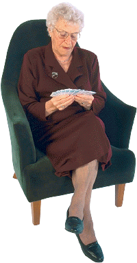 oolt un seet op Kneen op't Sofa. Bet Oma nu de Korten op'n Disch