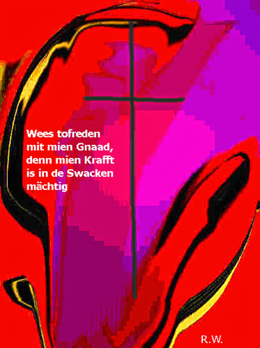 Faken much 'k mi geern drücken, man denn schüddelt mien Geweten mi dör, un ik maak, dat ik di to Gefallen bün. Denn du hest mi rett van de Sünnenschuld, du büst för mi an't Krüz gahn, hest all mien Undöcht dragen. Sull ik di denn nich to Gefallen wesen? Nicht, wiel dat mien Plicht is. Nee, wiel ik so dankbor bün, dat du mien Leven rett hest. Wiel du mi so leev hest! Un nu, wor du weer bi dien Vader büst, dür ik dien Spraagrohr wesen. Bruuk mi, mien Heer un Heiland, Jesus Christ, ok, wenn mi dat faken stur fallt. Laat mi wesen: