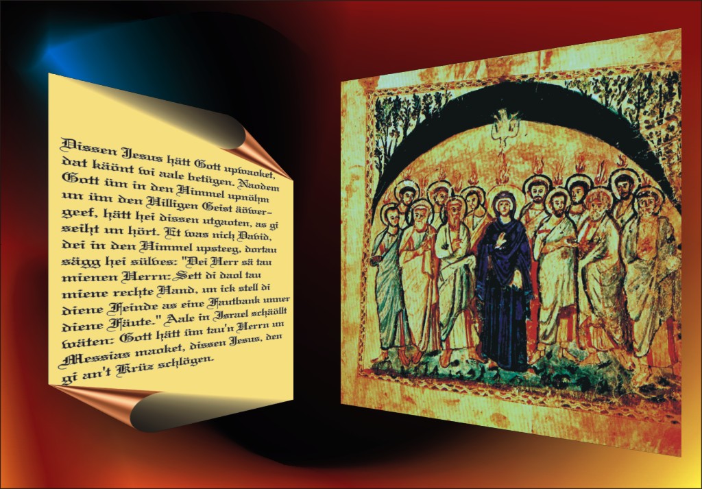 Wo schall ik di verstahn, du Hillig Geist? Wat is dat, wat du uns verspreken deist? Beseelen deist du mi to'n Beden; Giff Ogen, de den Broder ehrt, So is't, wenn du uns, Hillig Geist, 5.6.2022