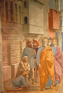 Un denn, en Dag, dor kemen twee Minschen, kene rieken, kene besünners bekannten Minschen, twee ganz eenfache Fischerlüüd. All de annern harrn dat bannig ielig, an em vorbitokamen, man disse beiden bleven vör em stahn, keken em an und snacken mit em. Sien Blick geiht noch up de Eerd dal. He waagt nich uptokieken, aver he föhlt, dat dor mit den Blick vun disse beiden Männer wat up em dal kümmt, wat he bitto nich beleevt hett. Un dat is ganz anners as de Freud över en Geldstück, nee, de Freud, dat een em as Minschen ankiekt, dat se sien Schicksal wieswarrn un sik dor Gedanken över maakt un mitföhlt, eenfach bi em sünd. Toeerst hett he gor nicht recht mitkregen, wat se meent, he weer dat ja nich wennt, dat em een ansnackt. Aver denn hett he dat doch begrepen. Se hebbt keen Geld! seggt se. Man de Naam, up denn se sik beropen, den hett he al mal höört: Jesus Christus! Weer dat nich de, de so vele stackelige Minschen holpen hett, den se an 't Krüüz slaan hebbt un vun den se seggt, he weer wedder uperstahn?