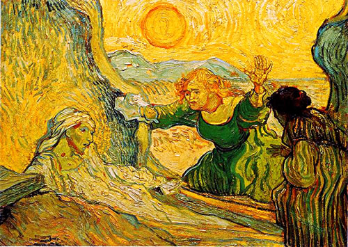 5. Fastensonntag: Jesus weckt Lazarus up. Een ut Bethanien Lazarus weer süük worrn. In dat Dörp leevt Maria mit ehr Süster Martha. Disse Maria ward den Herrn mit Salvööl salven un sien Fööt mit ehr Håår afwischen. De süük Lazarus, dat weer ehr Broder. De Süstern schicken nu to Jesus hen un leeten ehm seggen: 'O Herr, süh doch, dien Fründ is so süük!' As Jesus dat to höörn kreeg, dor spröök he: "Sien Süükdom föhrt nich to 'n Dood, ne, to Gotts Ehr; dörch dat schall Gotts Söhn herrlich maakt warrn." Jesus harr ja doch Martha un ehr Süster un ok Lazarus leev. As he nu höört harr, dat de süük weer, do bleev he liekers noch twee Daag dor, wo he jüst weer. Nahsten spröök he to de Jünger: "Wi willt man wedder nah Judäa trecken." De Jüngers sään to ehm: "Du Meister, annerletzt wulln de Juden di steinigen. Un nu treckst du dor doch wedder hen?" Dor antert Jesus: "Hett so 'n Dag nich twölf Stünnen? Wenn een bi Dag rümtrecken deit, dennso stött he narms an. He süht ja doch dat Licht vun disse Welt. Treckt avers een bi Nacht rüm, dennso stött he enerwegens an; he hett ja keen Licht dorbi." So spröök he un reed nahsten to jüm: "Uns Fründ Lazarus is toslapen. Man, ik will hentrecken un ehm opwecken." Sien Jünger meinten nu: "Herr, wenn he toslapen is, dennso ward dat sachts beter mit ehm." Jesus harr ja doch vun sienen Doot reedt. Se avers meinten, hei harr vun't Indruseln bi't Slapen spraken. Dor reedte Jesus heel apen un frie to jüm: "Lazarus is doot. Avers wegen juuch freu ik mi, dat ik nich dor west bün. Nu avers wíllt wi to ehm hengahn." Thomas sää to de Mitjünger: "Dennso willt wi ok mit ehm gahn un ok mit ehm starven." Jesus keem nu hen un fünn rut, Lazarus leeg al veer Daag in't Graff. Bethanien weer ja neeg bi Jerusalem, üm un bi föfftein Stadien af; 1 Stadium is bi 192 m lang, dat sünd denn meist dree Kilometer. So weern en ganz Reeg Juden to Martha un Maria kamen un wulln ehr wegen ehren Brauder trösten. As Martha nu höört, Jesus kümmt, dor güng se ehm in de Mööt; Maria bleev avers to Huus sitten. Martha hööl Jesus dat vör: "O Herr, weerst du hier weest, mien Broder weer nich storven. Man, ik weit ja doch, um wat du Gott bidden deist, dat gifft Gott di." Jesus spröök to ehr: "Dien Broder ward uperstahn!" Nu wedder Martha: "Ja, ik weet, he steiht op bi dat Operstahn an'n Jüngsten Dag." Dor Jesus: "Ik bün doch de Uperstahne un dat Leben. Wokeen an mi glöven deit, de ward leven, ok wenn he starben mutt. Un jedeen, de leevt un an mi glövt, de ward ni nich starben op ewig nich. Kannst du dat glööben?" Dor sää se: "Ja, mien Herr, ik bün