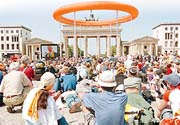 150000 Minschen drückt sik tosamen vör dat prächtige Tor, op de Siet vun'n Deertengaarn (Tiergarten). In düsse Masse bahnt us bloots de Rullstohl en Weg; willig maakt de Lü Platz, wenn se noch köönt, so dat wi denn en goden Platz achter de Bläser bi't Podium kriegt, ünner den sweven Hillgenschien. Veerdel vör söss gaht alle Klocken vun de Stadt: De Karkendag warrt inlüüdt. De groten Massengottsdeenste to de Eröffnung un to'n Afsluss
