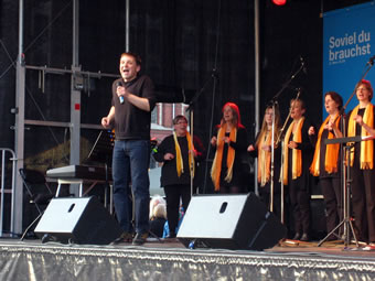Podiumsdiskussion mit Peter Harry Carstensen. Och nöö, lot uns man lever hier buten sitten blieven. De jungen Lüüd mookt so feine Musik, mit ehr Posaunen. Een fründliche Mann in grööne Jack stüürt op uns to. "Moin, ik bün vun de Kieler Norichten, dröf ik se 'n beeten wat frogen?" Di tun Dat un an End en Bild vun Willi un mi. "Is morgen in't Blatt." He wannert wieder. Middagsgebeed op Platt. Nich ganz vull, ook good. Komodiger. 2. Vadderunser. Lütte Paus mit Notproviant.